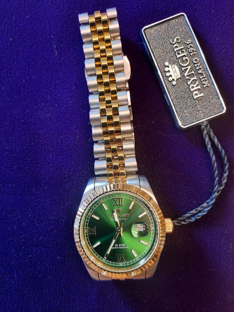 orologio bicolore quadrante verde, corona a vite, diametro 40mm, fondo chiuso a vite