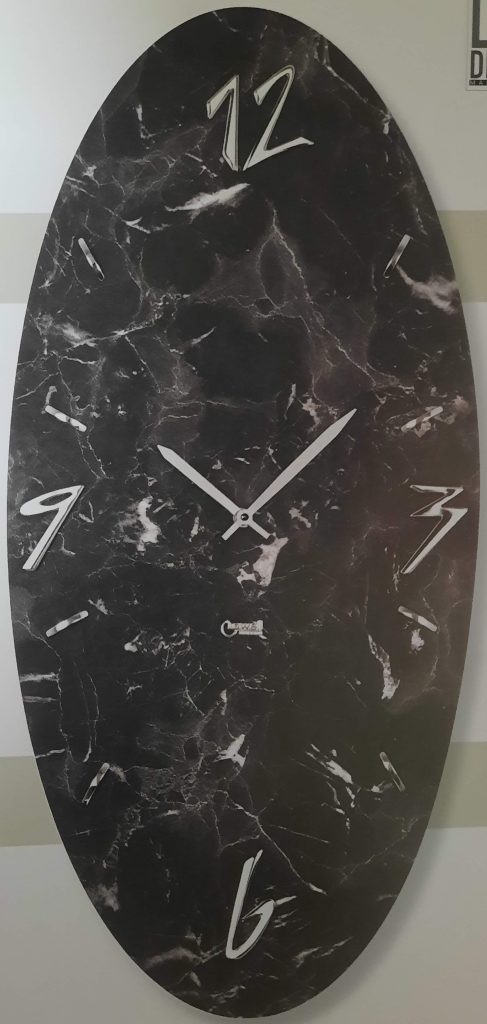 Orologio ottenuto con pannello di Legno effetto Marmo, numeri in Ottone Cromato. Misure 40 x 80