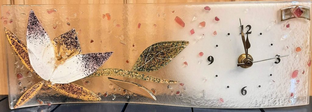 Orologio da tavolo, realizzato a mano artigianalmente dai Maestri Vetrai Veneziani, tasselli di vetro colorato in rilievo, graniglia e foglia oro. Dim. cm 16 x 30